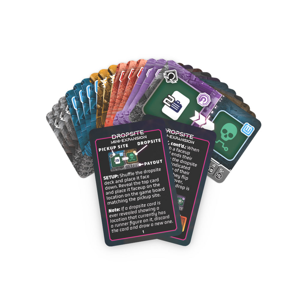 Add 15 cards for more gameplay options when playing Metrorunner. Dropsite cards offer a new path to gain points around Mirror City's districts! Pick up a quick mission and run it to a destination on the board to earn a bonus. The more drops you deliver, the more points you'll earn at the end of the game!